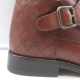 - Material & color: Brown leather with detailed quilting and a cap-toe finish.