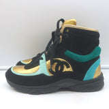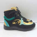 Chanel 19A Lace-Up High Top Sneakers Black Suede & Gold Metallic Leather Size 38