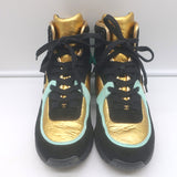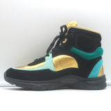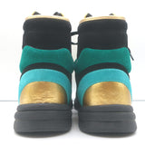 Thoughtfully curated from a pre-owned collection, this pair blends soft black suede with shimmering gold metallic leather accents for a look that reads both sporty and elegant. The high-top profile and lace-up closure create a flattering silhouette that pairs equally well with tailored trousers or denim.