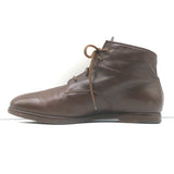 Crafted in supple brown leather with a classic lace-up front and a flat, low-profile sole, these ankle boots read refined and versatile — ideal for pairing with jeans, tailored trousers, or dresses. The silhouette shows the label’s attention to proportion and material, giving a minimalist look with subtle artisanal character.