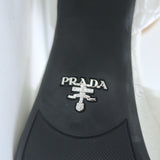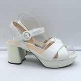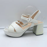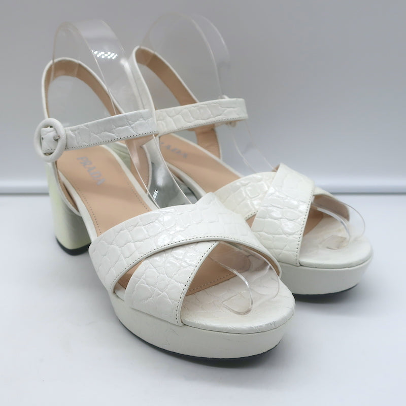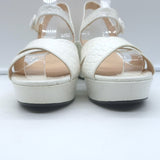 Worn once! Good condition. No major wear, yellowing on heels from storage. Tiny scuff and a small pink smudge on exterior side of left platform. Small scuff on interior side of right strap and on right heel. A few faint smudges on insoles. Does NOT come with box or dustbag. Retails for $690!