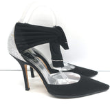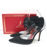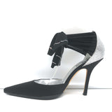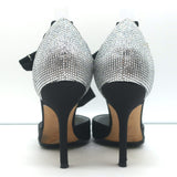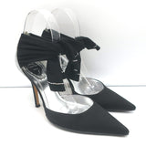 Gently worn. Good condition. No major flaws, faint brown smudge on exterior side of right heel. Wear on insoles. A few tiny snags on satin heels. Rubber soles have been added for extra traction. Comes with box and dustbag.