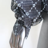 - Color/Pattern: Navy gingham with sheer embroidered mesh overlay