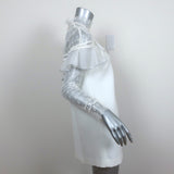 Pre-loved. Good condition. Some faint yellowing on chiffon ruffle and on center front of neck. Retails for $395!