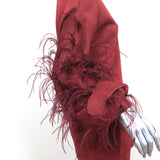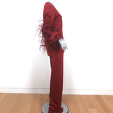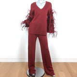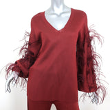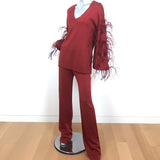 Valentino Feather-Trimmed Long Sleeve Top & Pants Set Red Viscose Knit Size 42