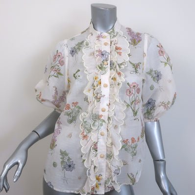 Zimmermann Jeannie Scalloped Puff Sleeve Blouse White Floral Print Cot...