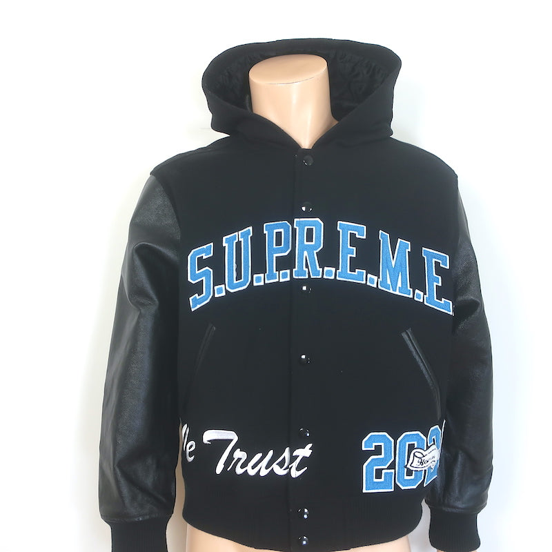Supreme King Leather-Sleeve Hooded Varsity Jacket Black Size Medium