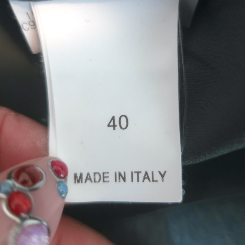 Pre-loved. Brown smudge on upper left sleeve may come out with cleaning. 70% poly, 30% silk -**-