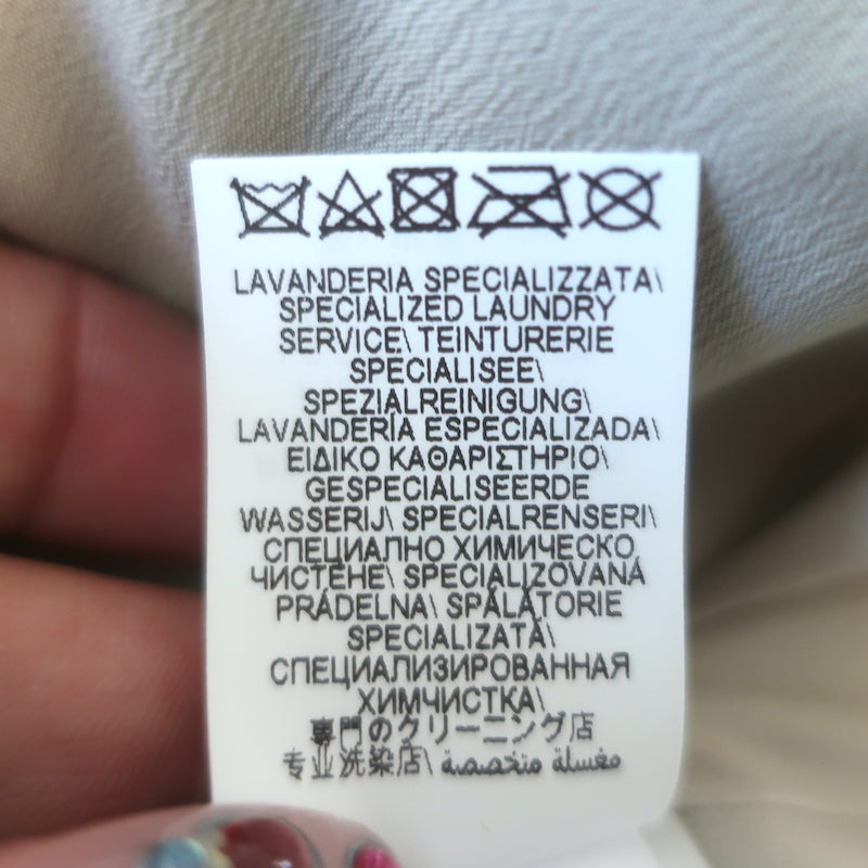Pre-loved. Yellow spot on front. Faint white smudge on left side above hem may come out with cleaning. 95% silk, 5% elastane...
