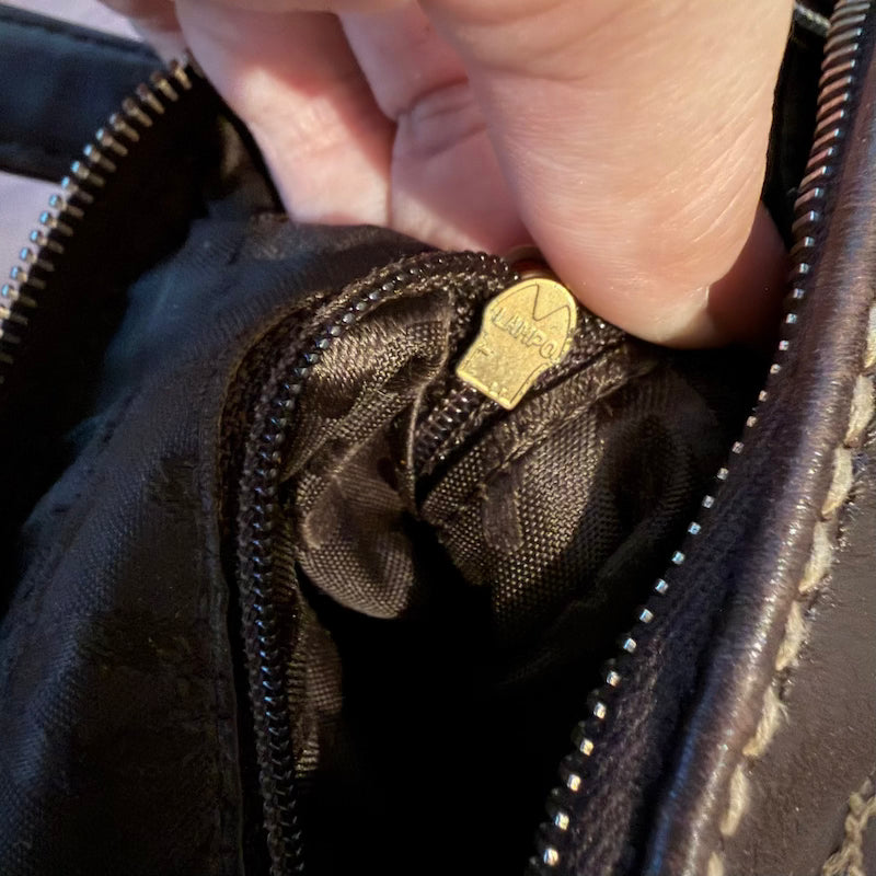 Gently used. Good condition. No major flaws, some very faint brown smudging on white stitching. Smudges on lining. White smudge on back...