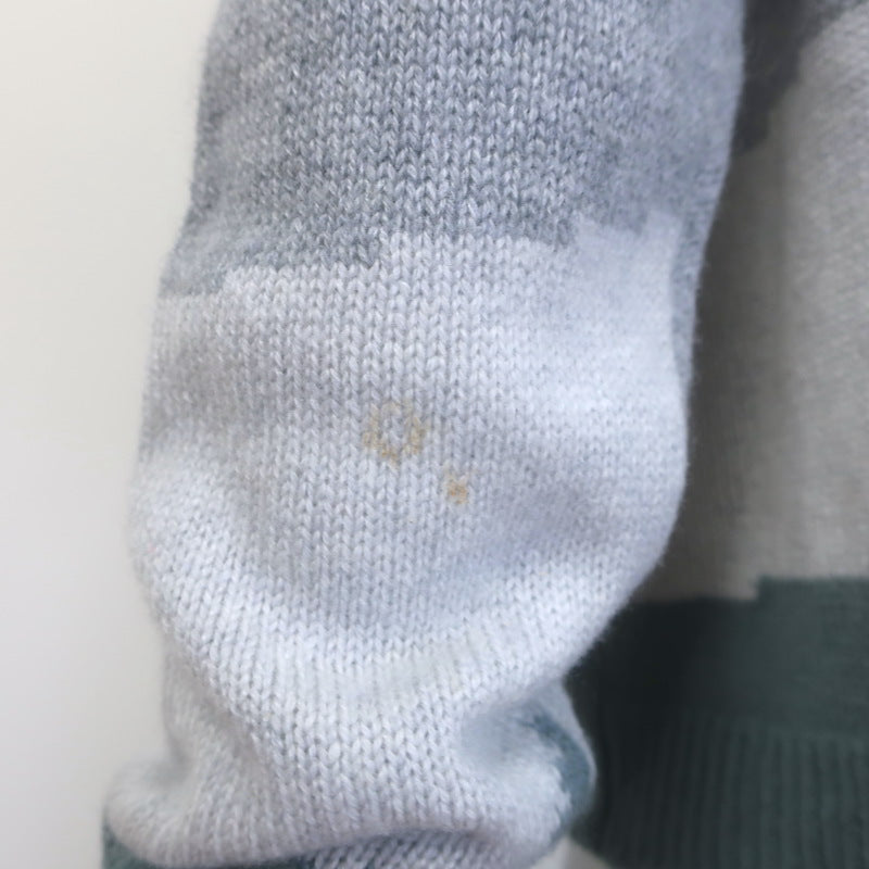 Pre-loved. Small, faint brown spot on front and 2 small brown smudges on back of left sleeve may come out with cleaning.