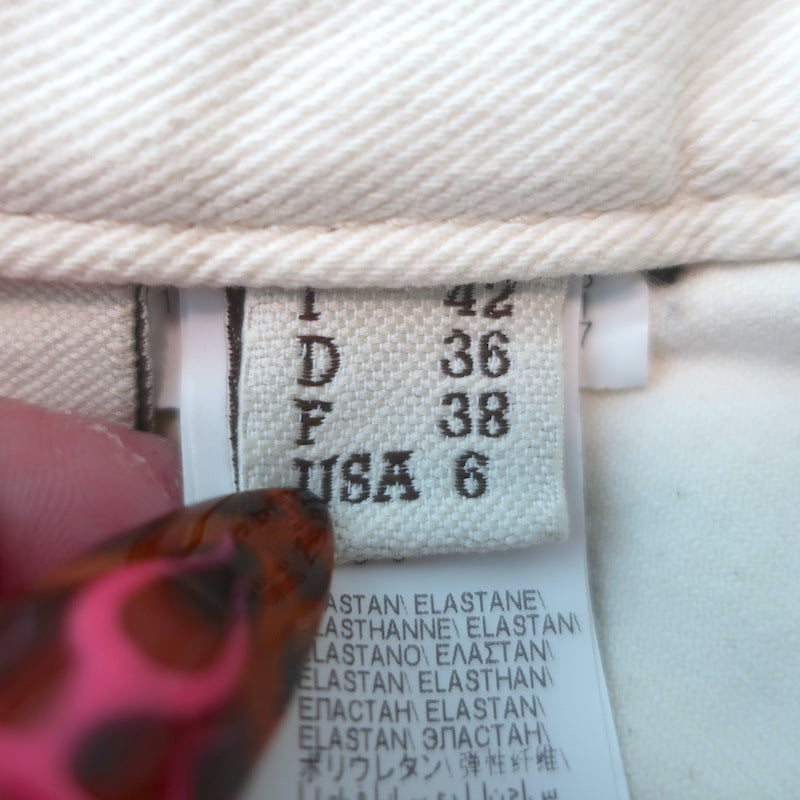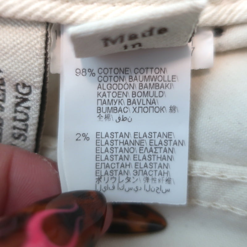 Gently worn. Good condition. No major flaws, 2 small, faint yellow spots on front right thigh. 60% cotton, 40% viscose -**-