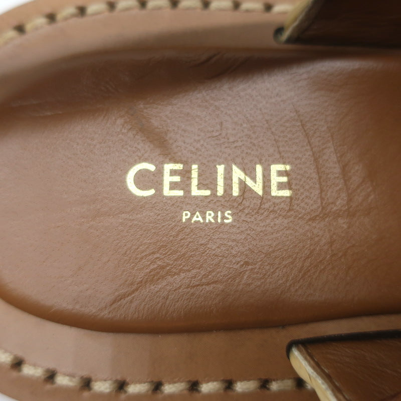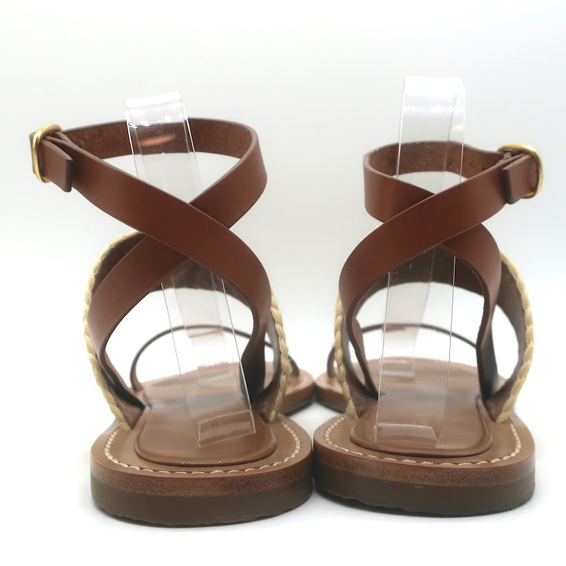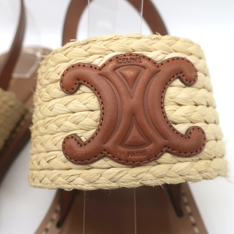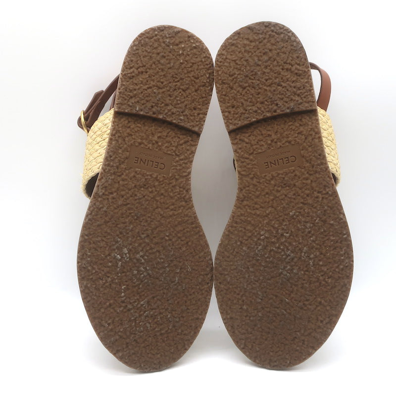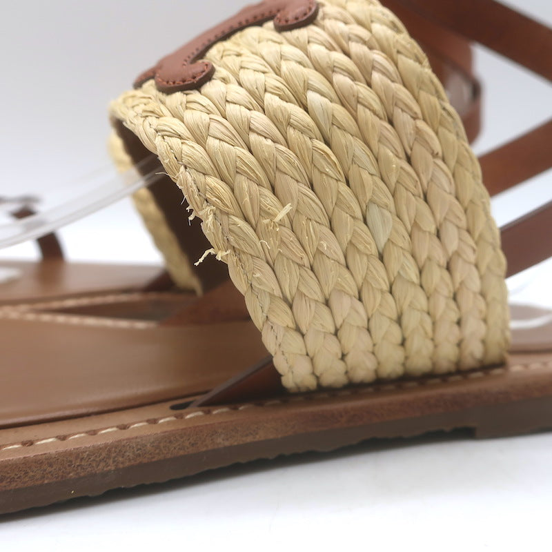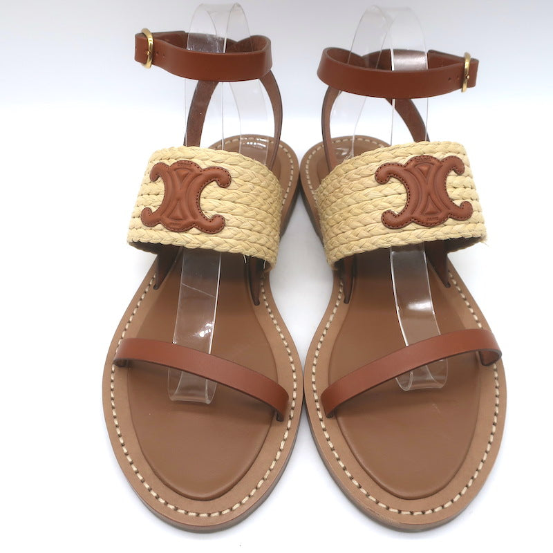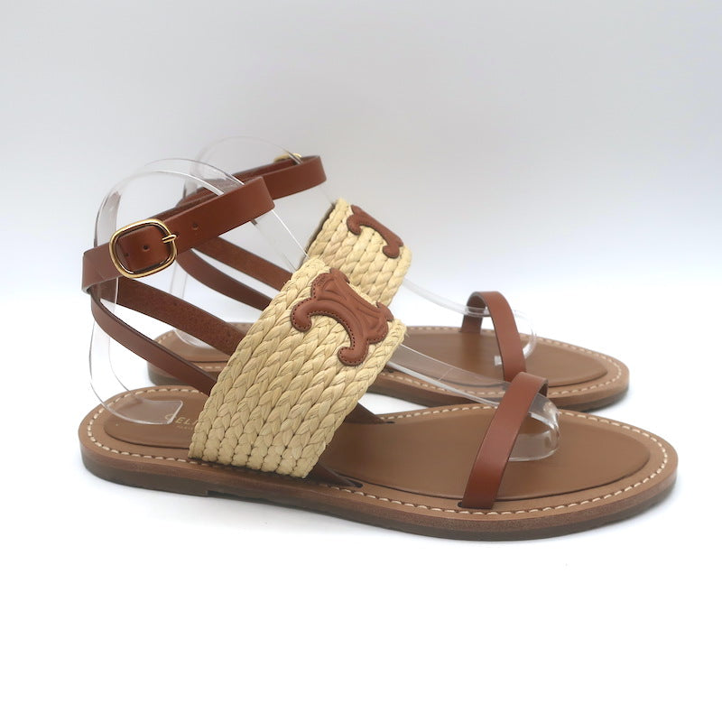 Celine Triomphe Raffia & Leather Flat Ankle Strap Sandals Brown Size 40