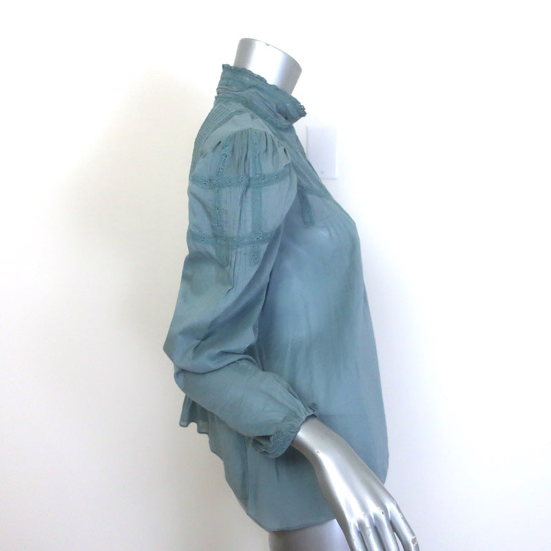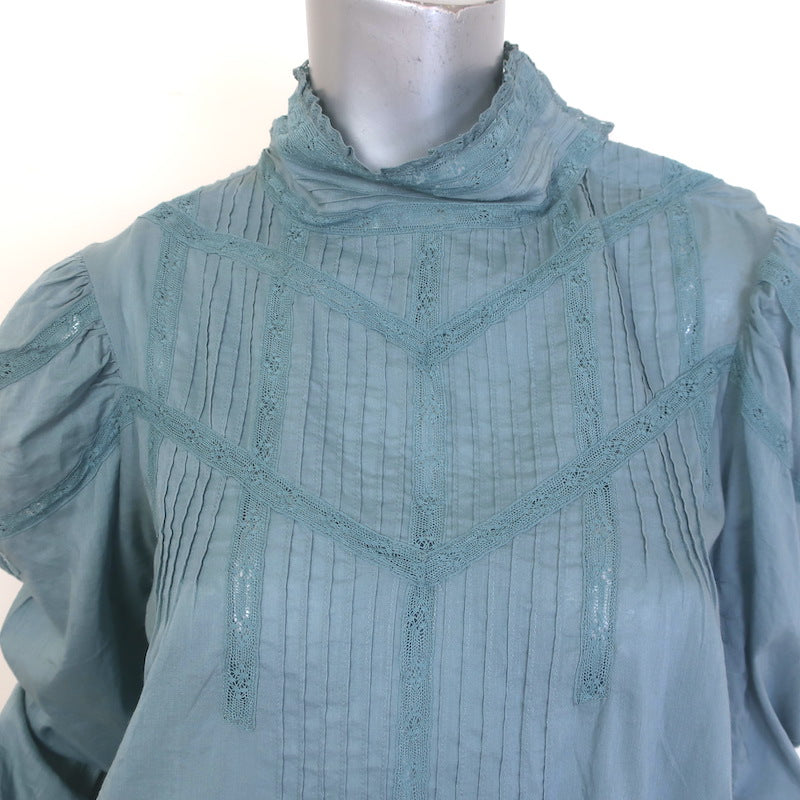 Doen Albertine High Neck Pintucked Top Blue Lace-Trimmed Cotton Size Small