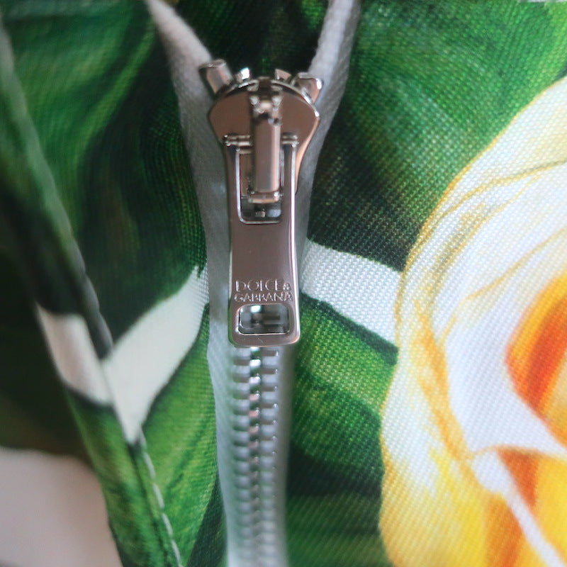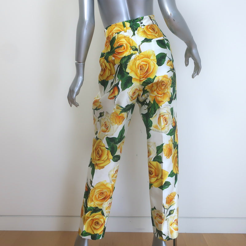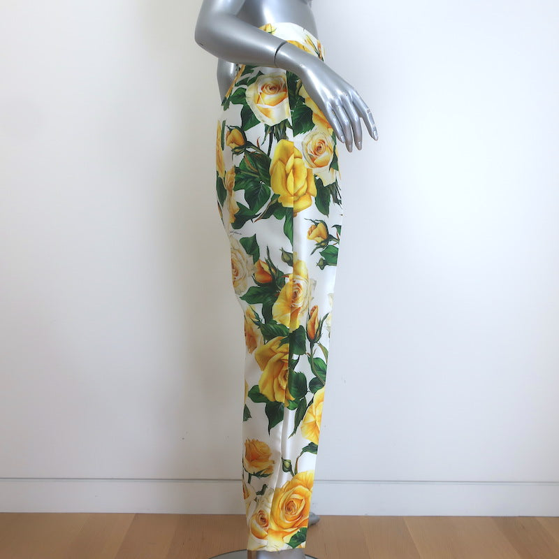 Dolce & Gabbana Rose Print Tapered Trousers White/Yellow Silk Twill Size 46