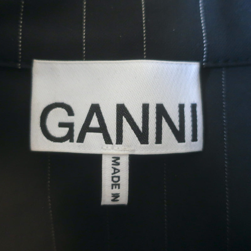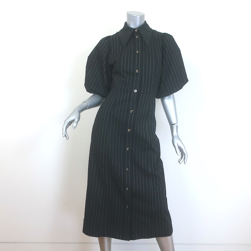 GANNI Pinstriped Puff Sleeve Midi Shirtdress Black Stretch Twill Size 32