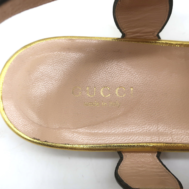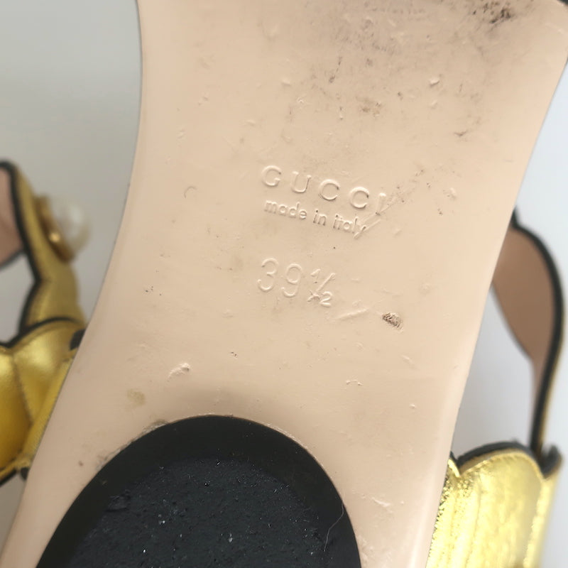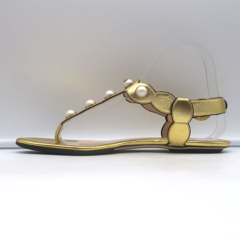 Gucci Willow Faux Pearl T-Strap Flat Sandals Gold Metallic Leather Size 39.5