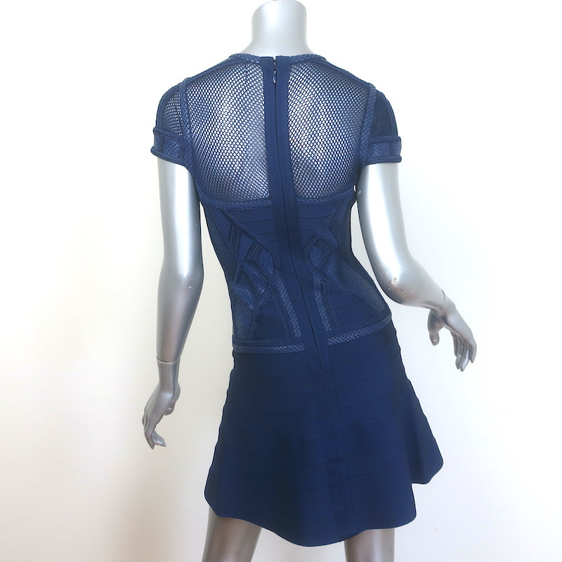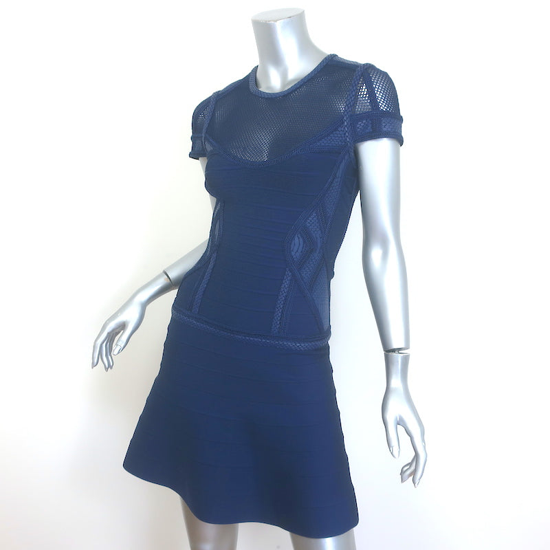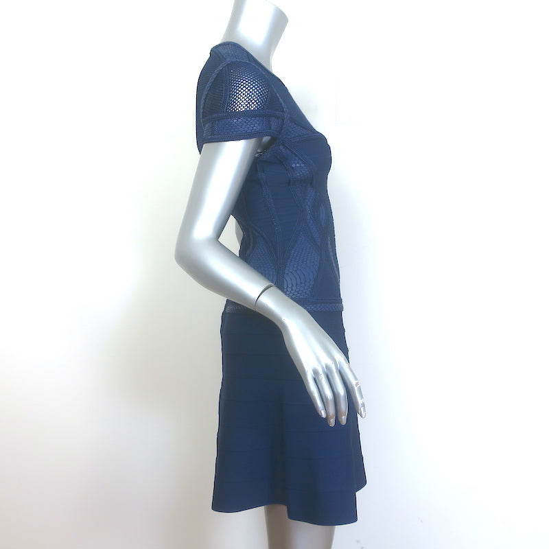 Herve Leger Snake-Embossed Leather & Mesh Bandage Dress Navy Size Medium