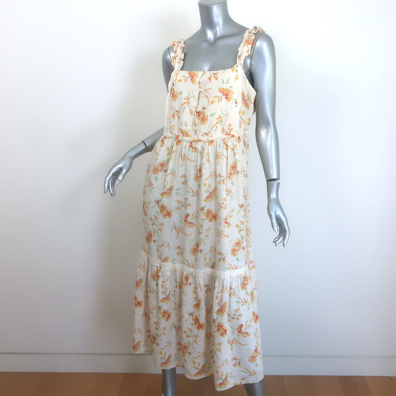 LoveShackFancy Ann Midi Dress Cream Floral Print Cotton-Linen Size Medium