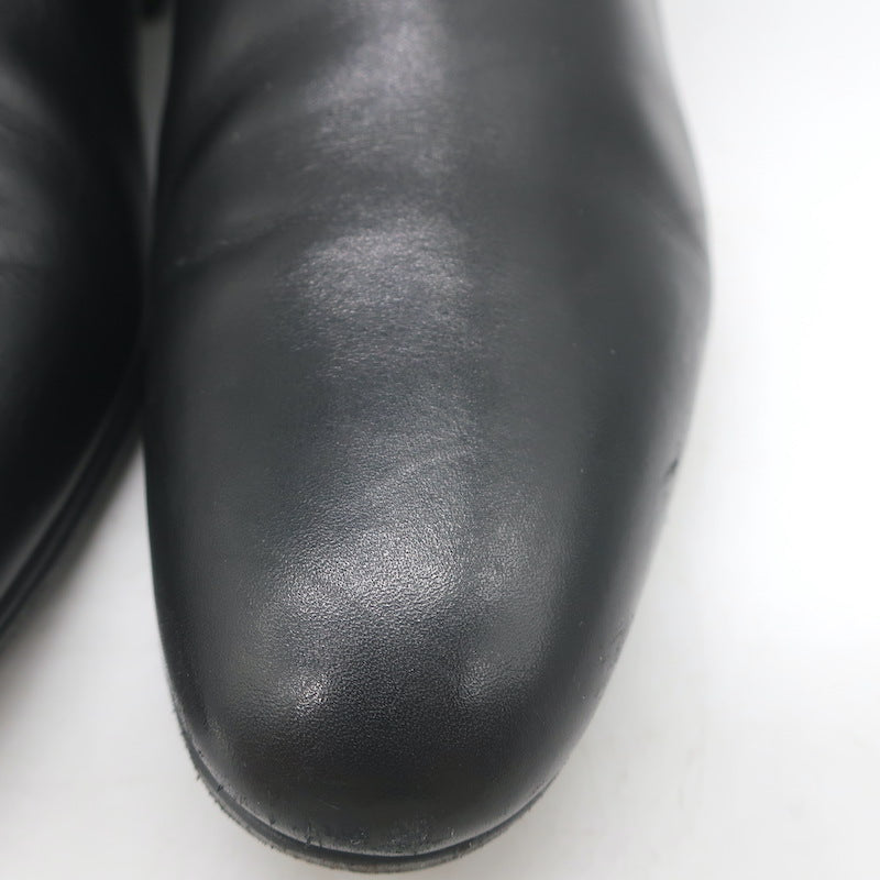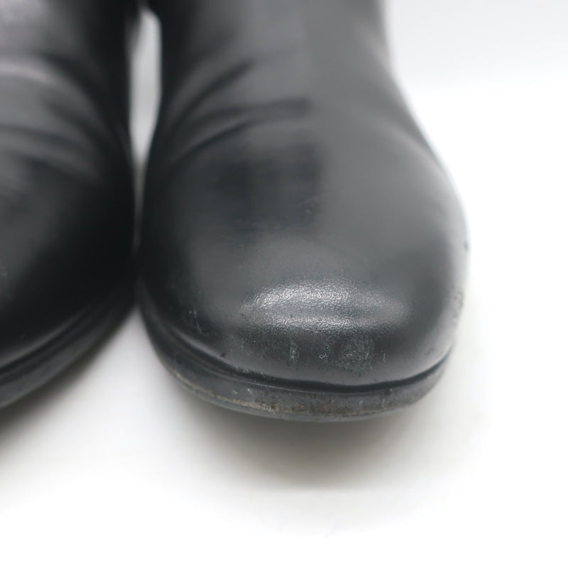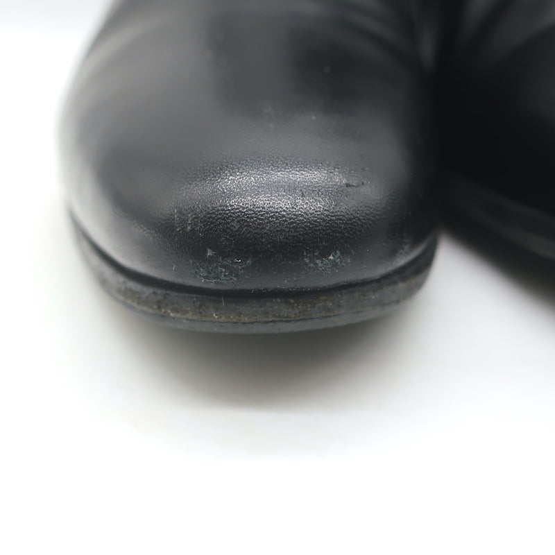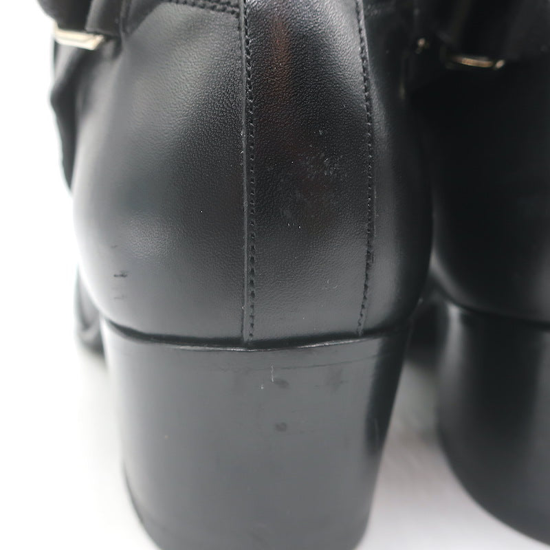 Pre-loved. Wear on heel and toes. Scratch on interior side of left ankle. Scuffs on leather on toes and interior sides of heels. Small scuffs on stacked heels. Boots are creased from walking. Rubber soles have been added for extra traction. Does NOT come with box or dust bag. Retails for $945!