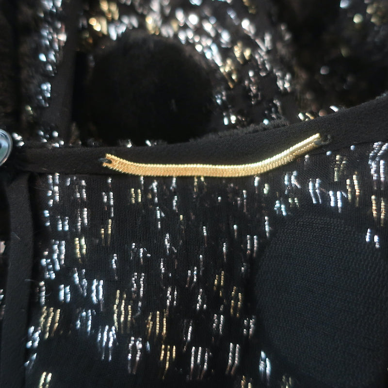 Pre-loved. There is one spot on left side seam where chain has become detached; should be an easy fix for a seamstress....