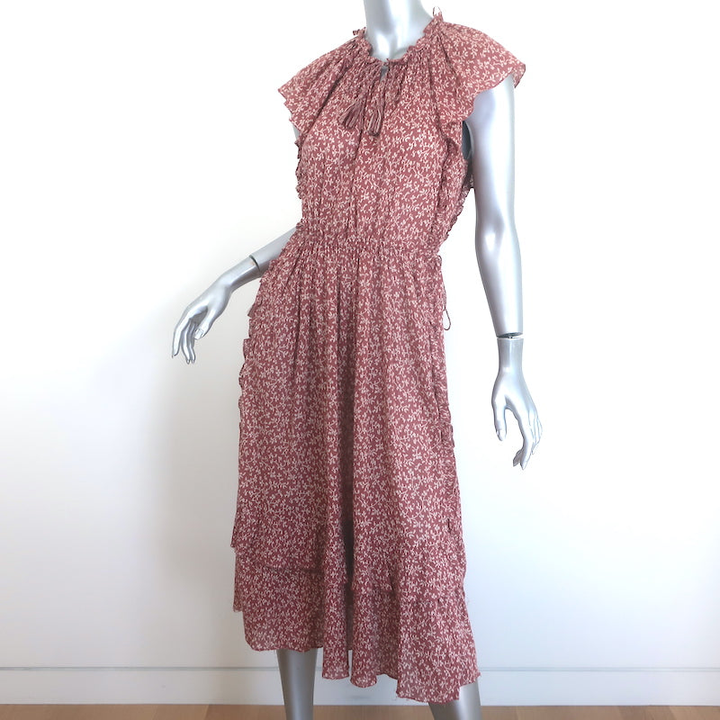 Ulla Johnson Anja Ruffled Tassel-Tie Midi Dress Clay Pink Printed Cotton Size 8