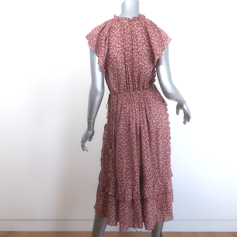 Ulla Johnson Anja Ruffled Tassel-Tie Midi Dress Clay Pink Printed Cotton Size 8 Measurements