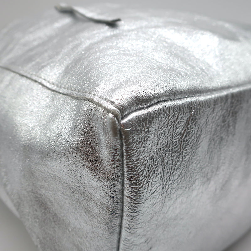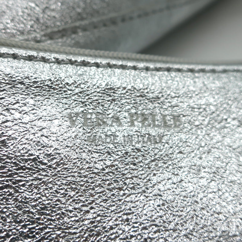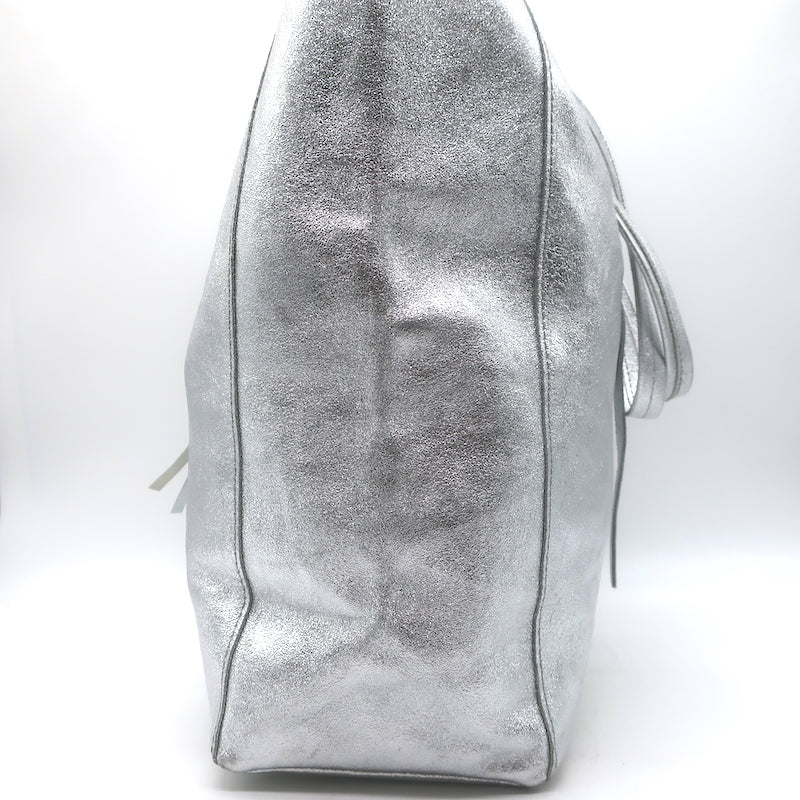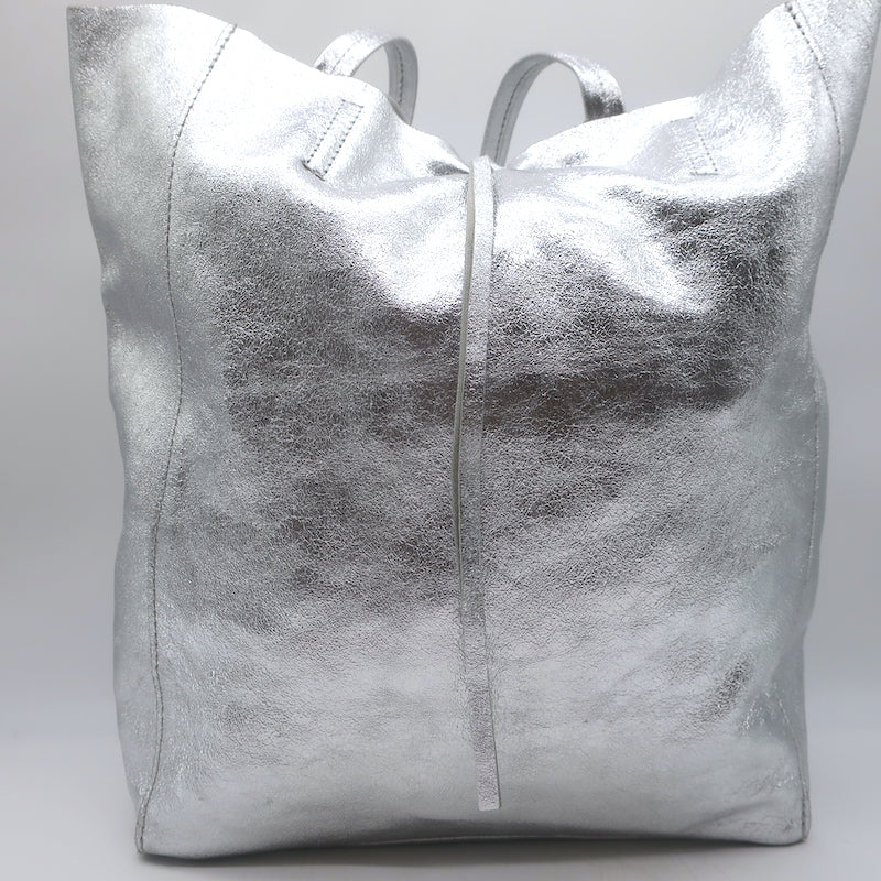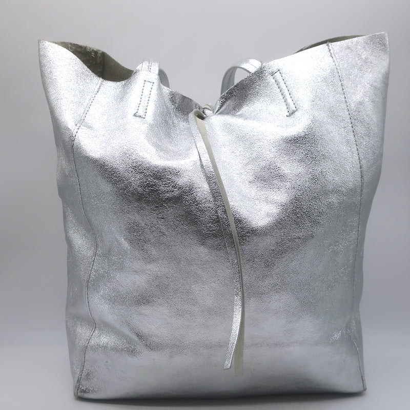 Vera Pelle Tie-Top Metallic Leather Tote Silver Large Shoulder Bag