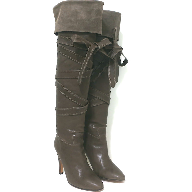 Chloe Wrap-Around Over the Knee Boots Dark Taupe Suede & Leather Size 38.5