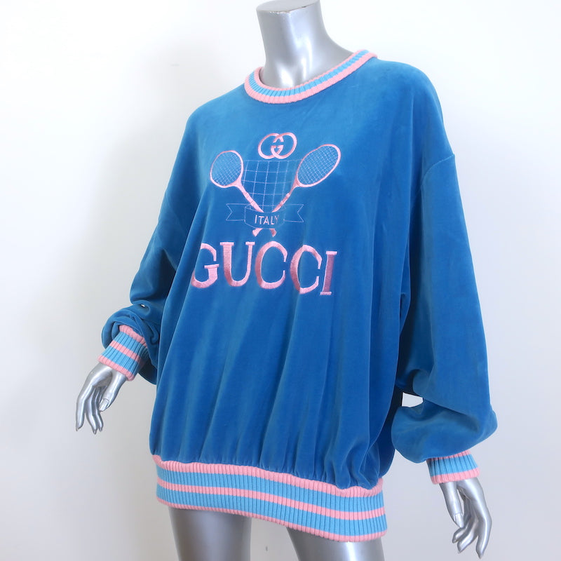 Gucci Embroidered Tennis Sweatshirt Blue Velour Size Medium