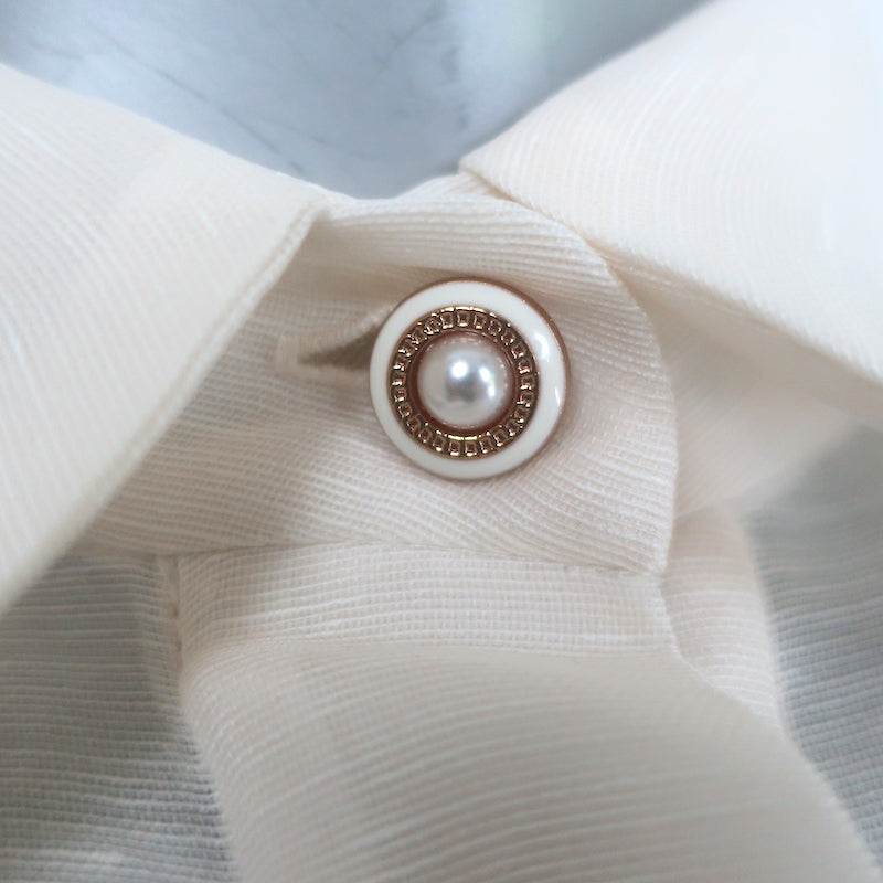 Pre-loved. Faint gray smudge on right sleeve and a small gray smudge on left side of collar may come out with cleaning....
