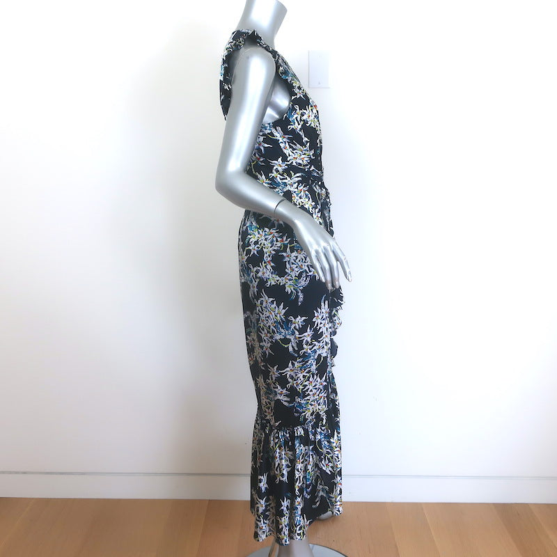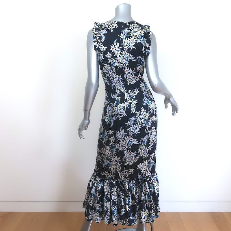 Cinq a Sept Mirna Asymmetric Ruffled Midi Dress Navy Floral Print Silk Size 6