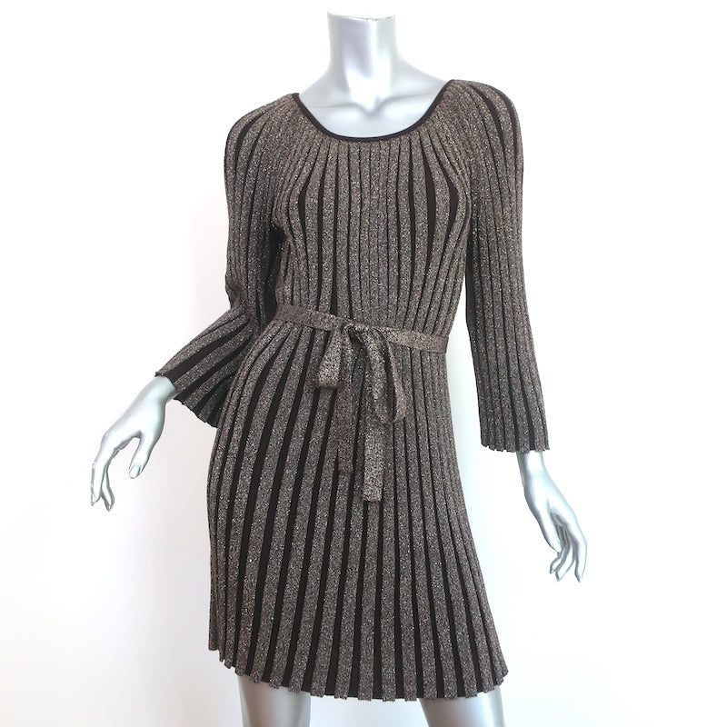Alice + Olivia Belted Mini Dress Gold/Brown Metallic Ribbed Knit Size Medium
