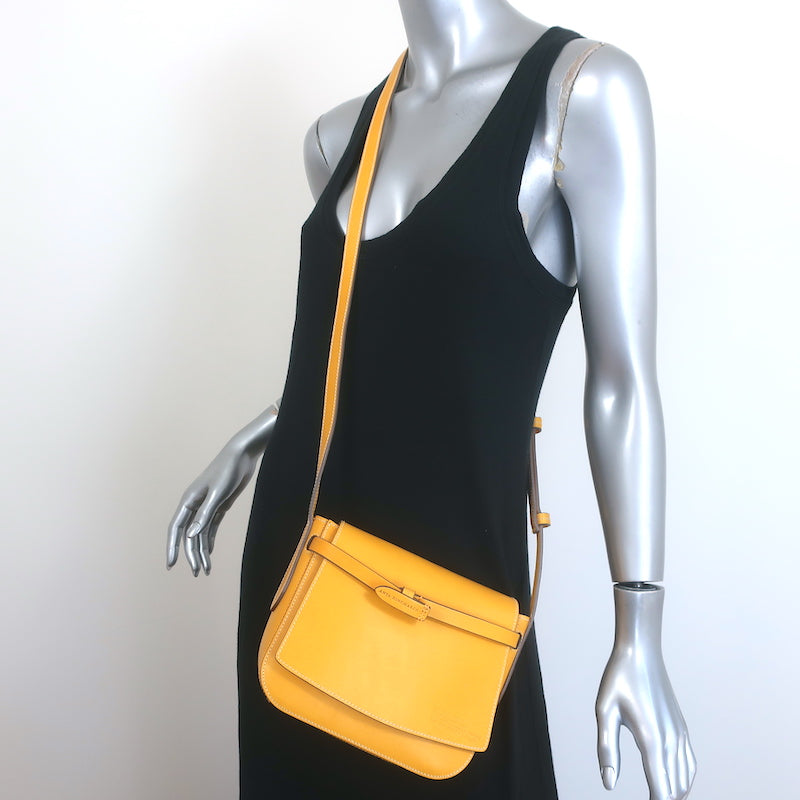 This pre-owned piece is crafted in smooth yellow leather with a classic flap closure and a streamlined crossbody silhouette — a small, wearable size that carries essentials without bulk. The bag shows light, carefully inspected wear: carried once, overall great condition, with a tiny gray speck on the base and small scuffs on the underside of the flap. It arrives with its dustbag for storage and protection.