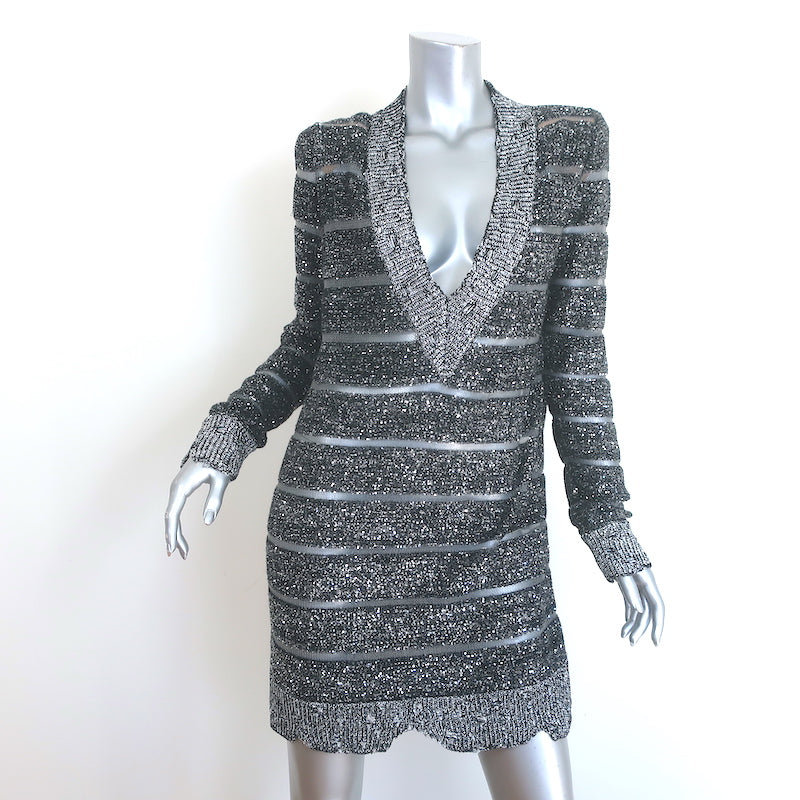 Balmain Sequined Striped Distressed Knit Mini Sweater Dress Black/Silver Size 36