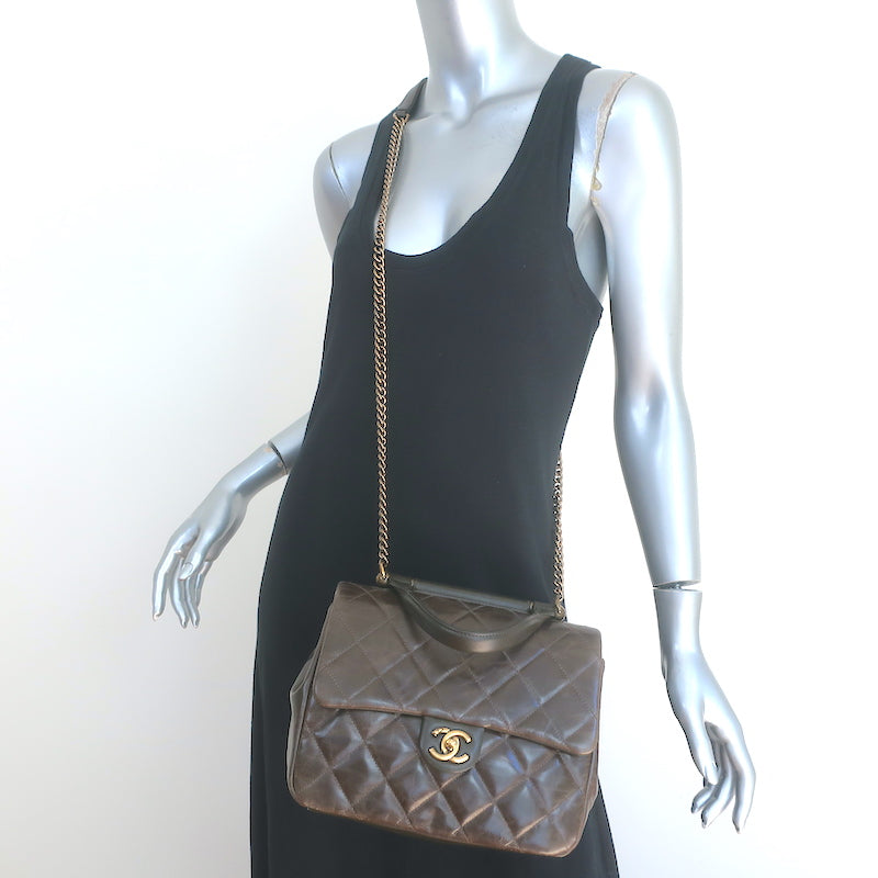Chanel 2017 Gold Bar Top Handle Bag Dark Brown Quilted Leather Crossbody