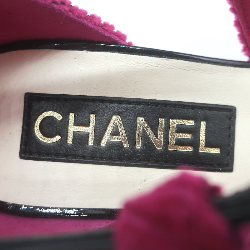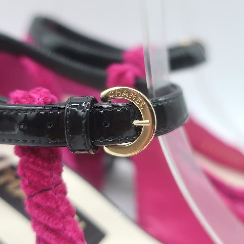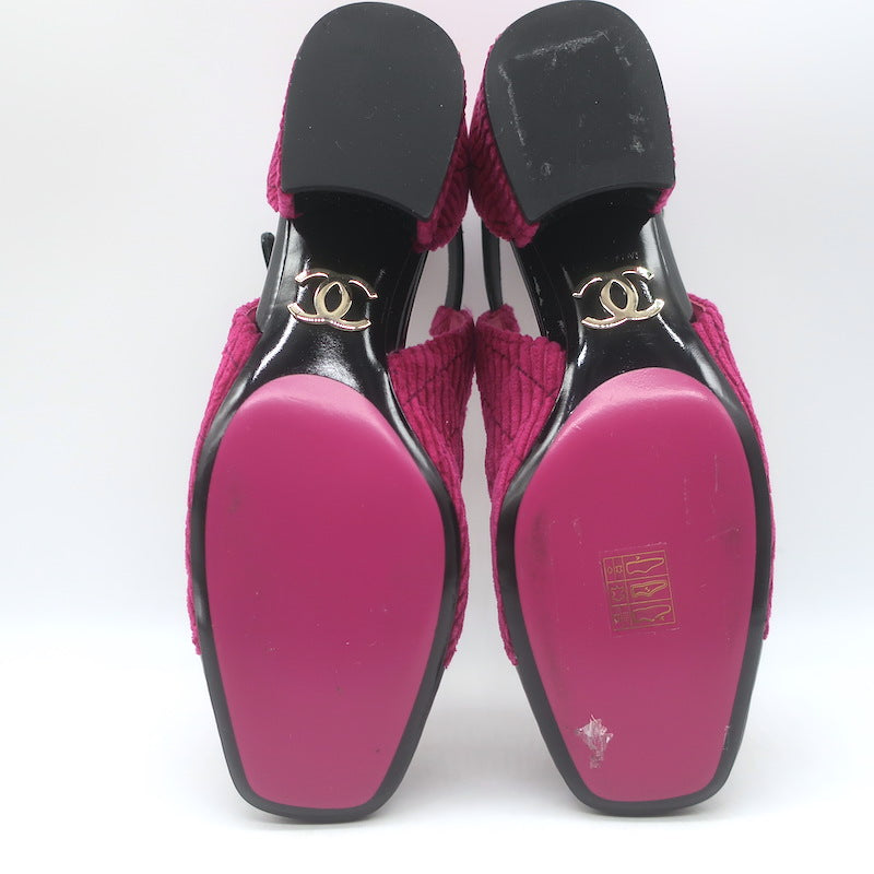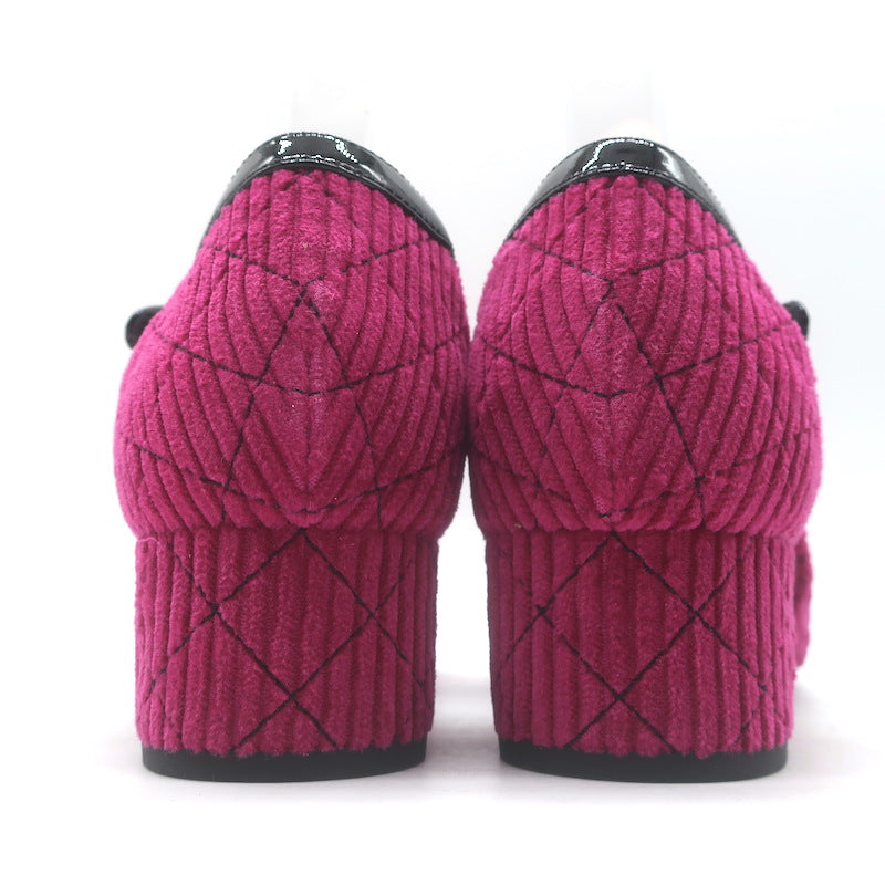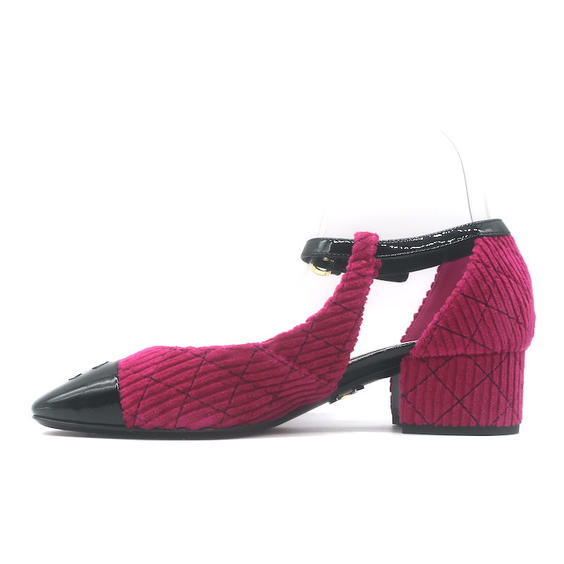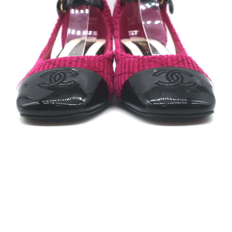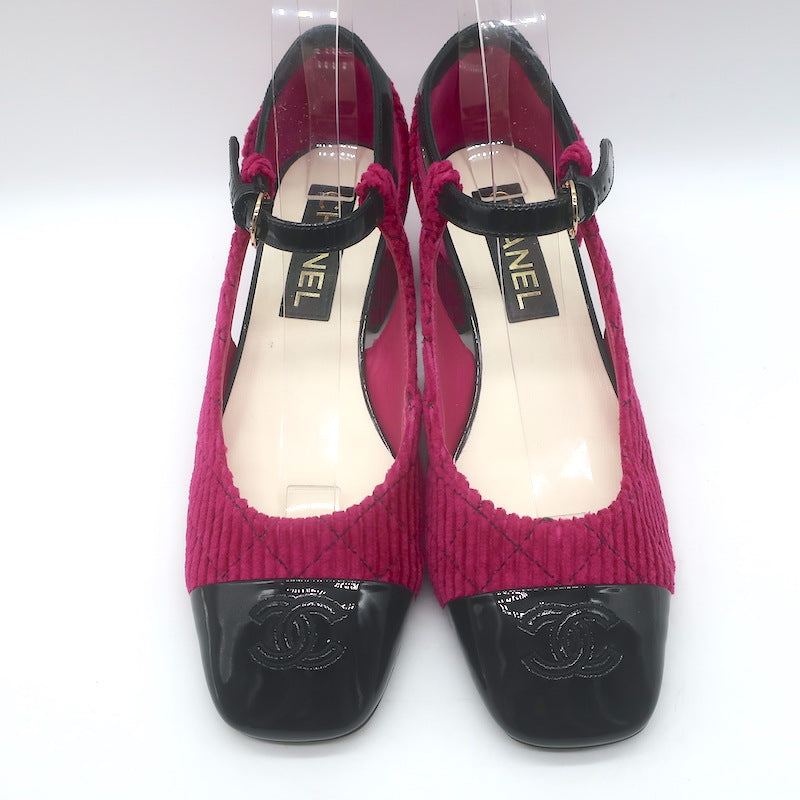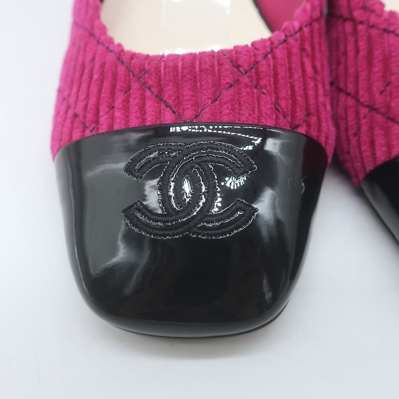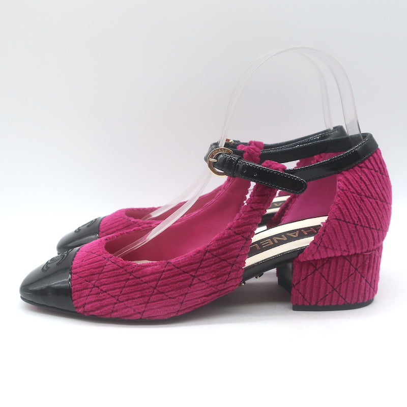 Chanel CC Patent Cap Toe Corduroy Mary Jane Pumps Fuchsia & Black Size 37.5 NEW