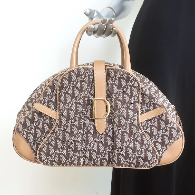 Christian Dior Double Saddle Bowler Bag Brown Diorissimo Canvas & Beige Leather