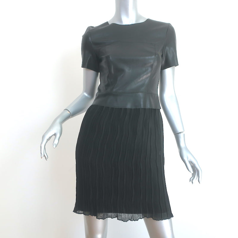 Drew Short Sleeve Dress Black Faux Leather & Pleated Crepe Size 4