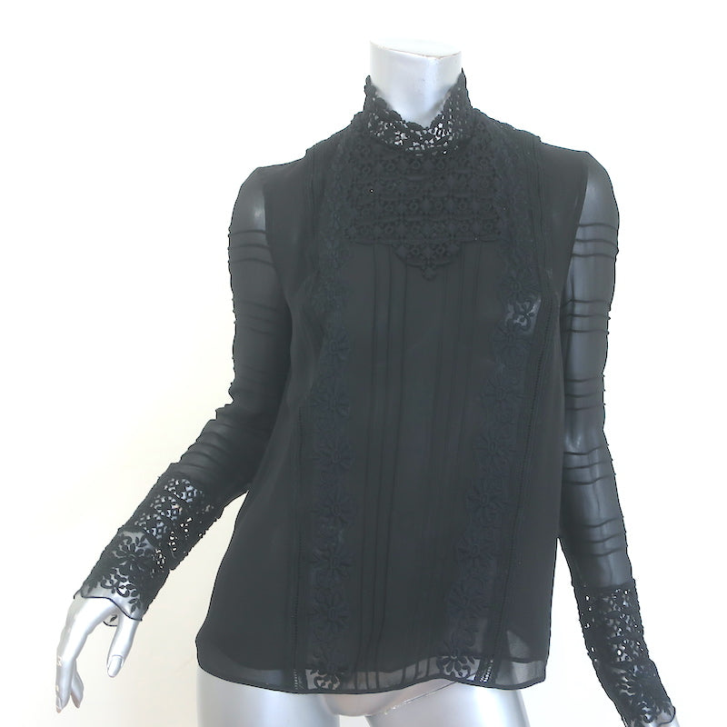 Giambattista Valli Crochet Lace-Trim Blouse Black Silk Size 42 Long Sleeve Top
