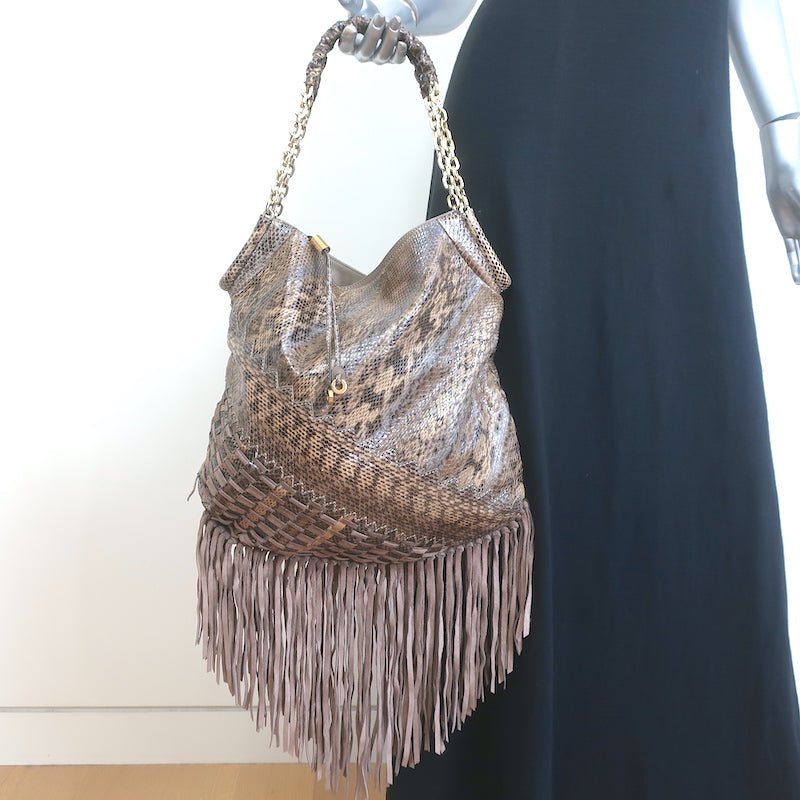 Jimmy Choo Tatum Fringed Elaphe Snakeskin Large Shoulder Bag Brown