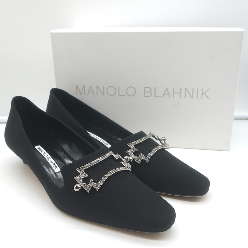 Manolo Blahnik Ansulialo 30 Crystal-Buckle Kitten Heel Pumps Black Silk Size 41
