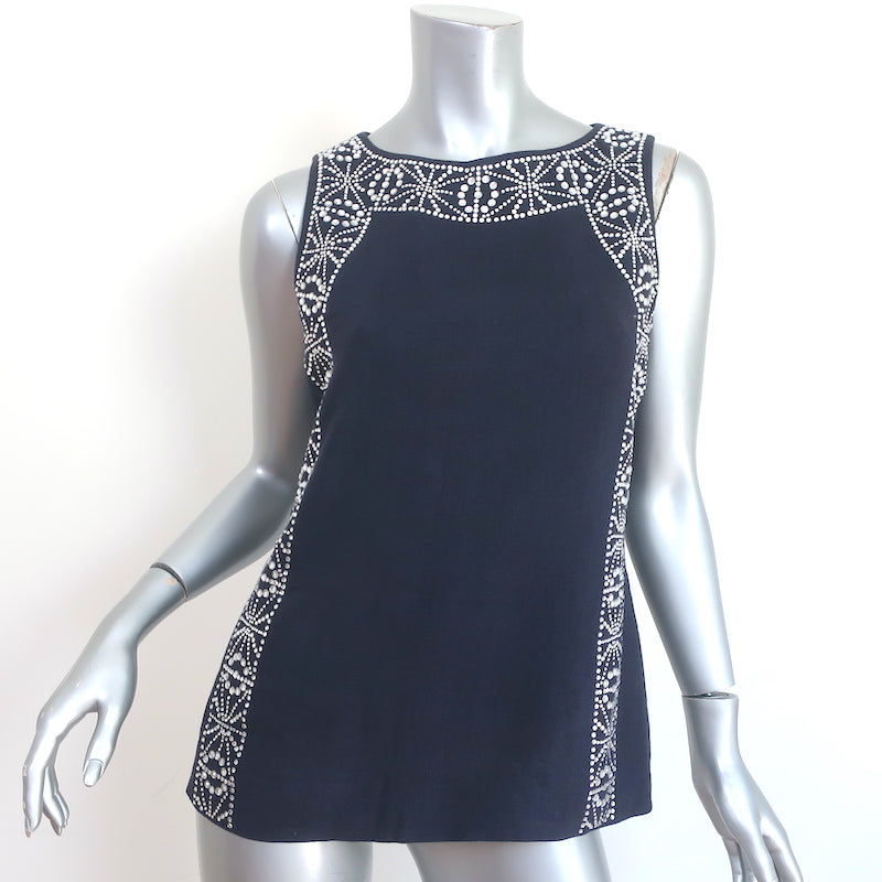 Tory Burch Crystal-Embellished Top Navy Linen Size 4 Sleeveless Blouse