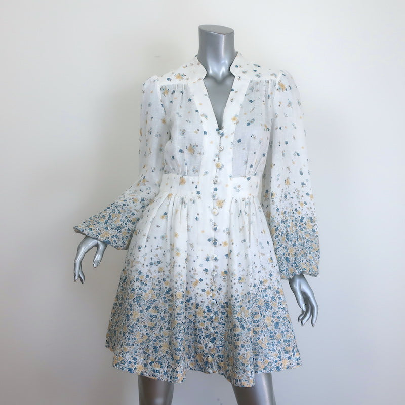 Zimmermann Carnaby Puff Sleeve Mini Dress White Ditsy Floral Print Linen Size 1