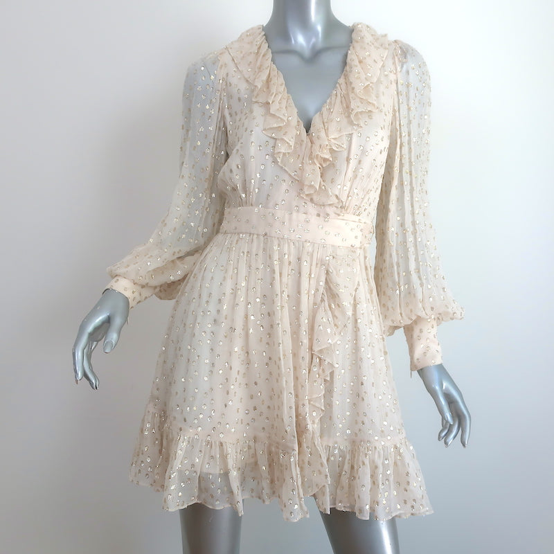 Zimmermann Lurex Polka Dot Mini Wrap Dress Ecru/Gold Crinkled Chiffon Size 0