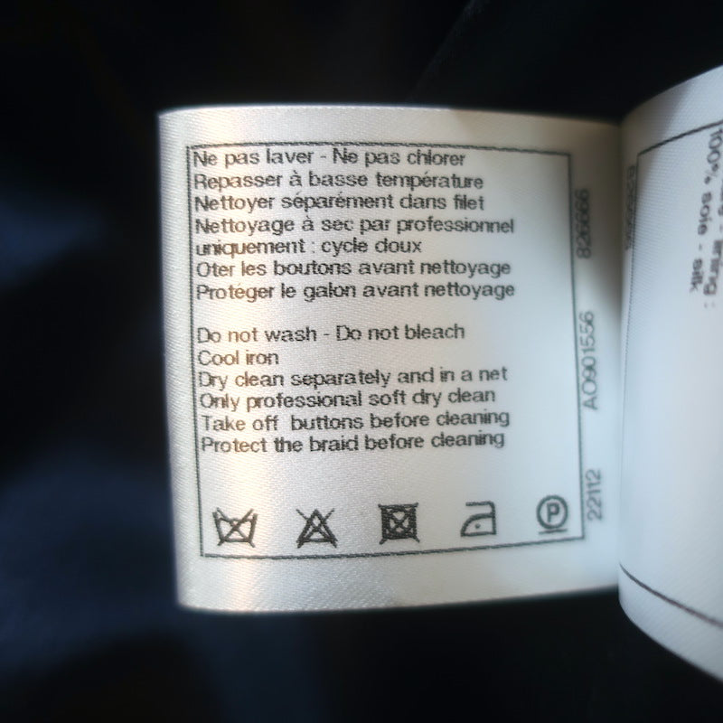 Pre-loved. Good condition. A few small smudges may come out with cleaning. Gold button cover has fallen off on left sleeve cuff.