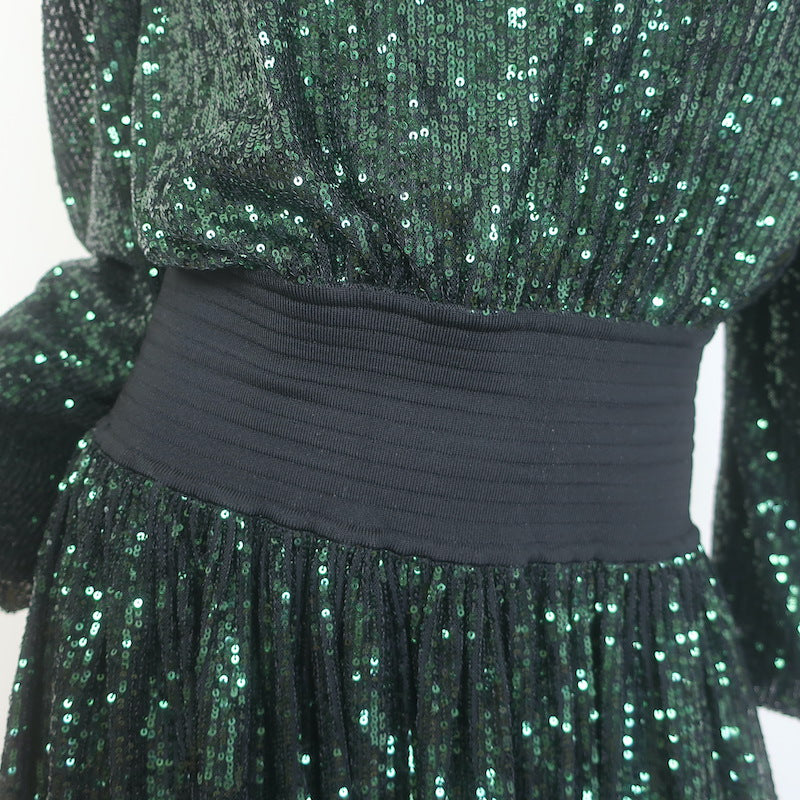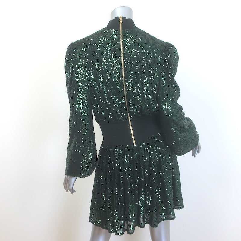 Balmain Sequined Puff Sleeve Mock Neck Mini Dress Emerald Size 40