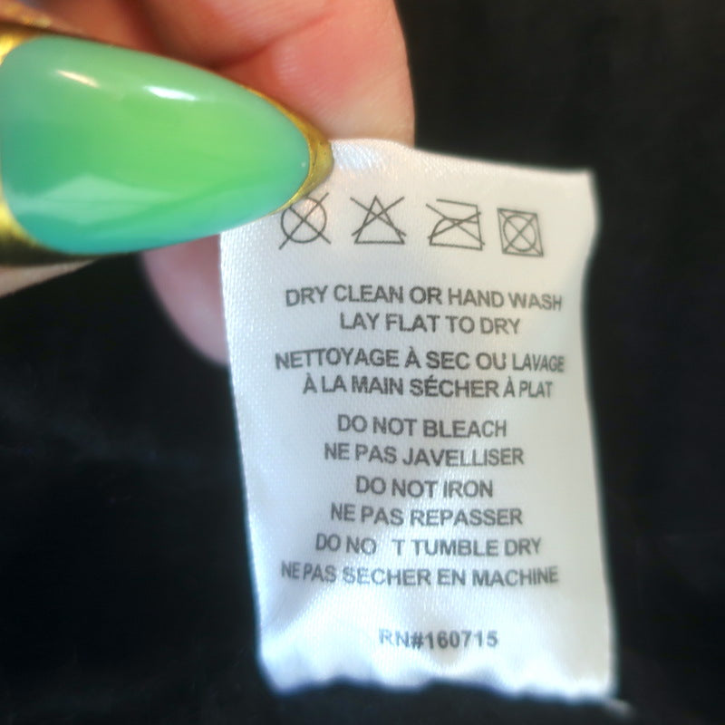 Pre-loved. A few tiny, faint brown spots on front and one on back of right sleeve may come out with cleaning. Fabric/care...