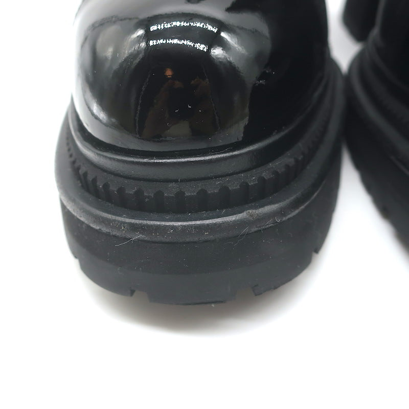 worn once. Good condition. No major wear, faint scuffing on leather on exterior sides of both toes and heels, and on exterior side of left heel. Small scratch in leather on exterior side of right boot and 2 on top of right toe. Very faint scuff on patent on right toe is only visible in certain lighting. Wood trim is lightly scuffed along edges of toes. A few small smudges on rubber. Comes with box and dust bags. Retails for $1,725!