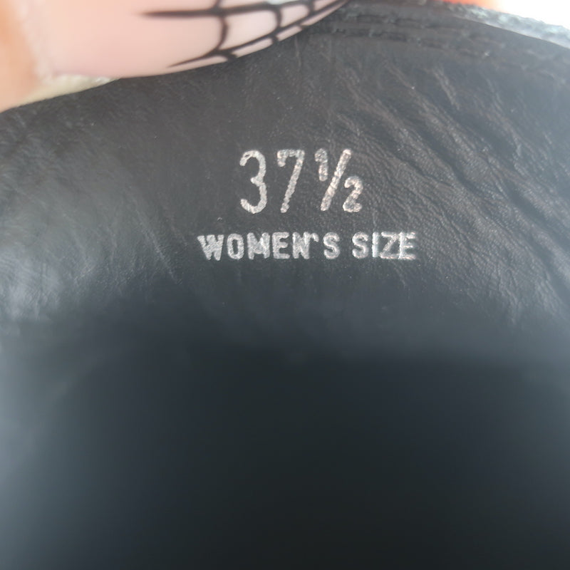 Pre-loved. Wear on toes and interior side of left heel. Small scuffs throughout. Brown spot on exterior side of left shoe. Smudging...
